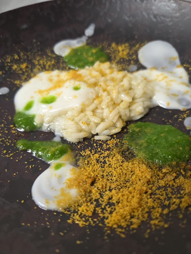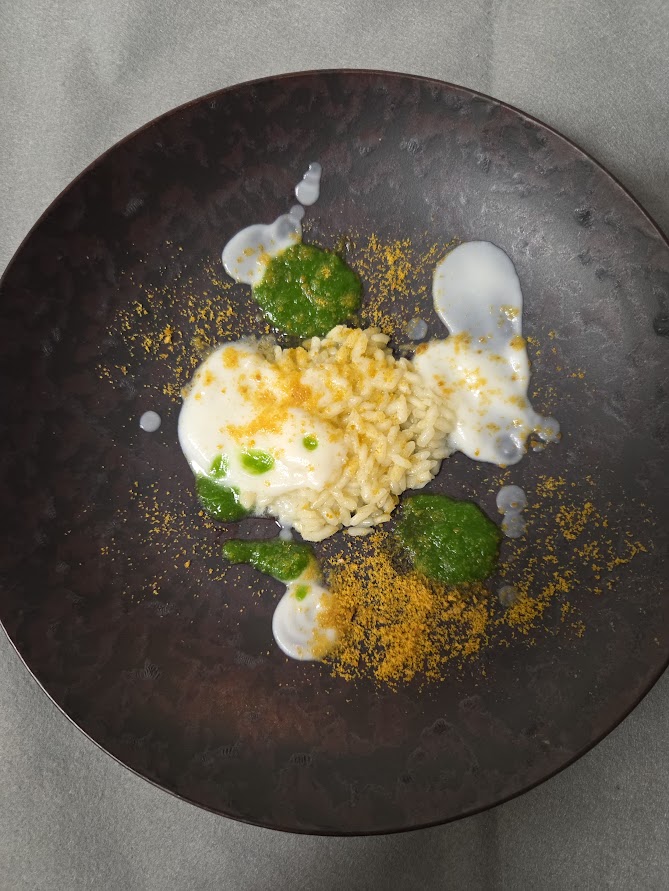秋蕪のまろやかな白いソースと、ほんの少しの苦みを感じる蕪の葉の緑のソース、そしてカラスミの複雑な塩気と旨味と、アルデンテに仕上げたお米。